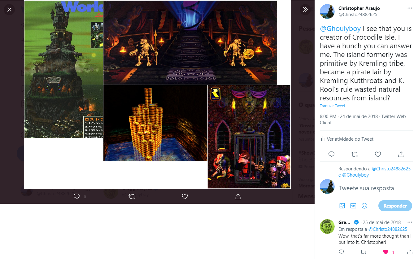 Zusammen mit Kackle und den Skello-Kritters, Kackle gehörte zur alten Klasse der Kremlings namens Krawall-Kremlings und lebte in der Kleinstadt liegt auf der zweiten Klippe von Krokodilinsel.[1][2] Während seines Todes lebte Kackle zusammen mit anderen Mitgliedern der Krawall-Kremlings noch in seinem verbliebenen Kleinstadt, das durch die Verschmutzung durch den Kremlingbande baufällig war.[3][4][5]
